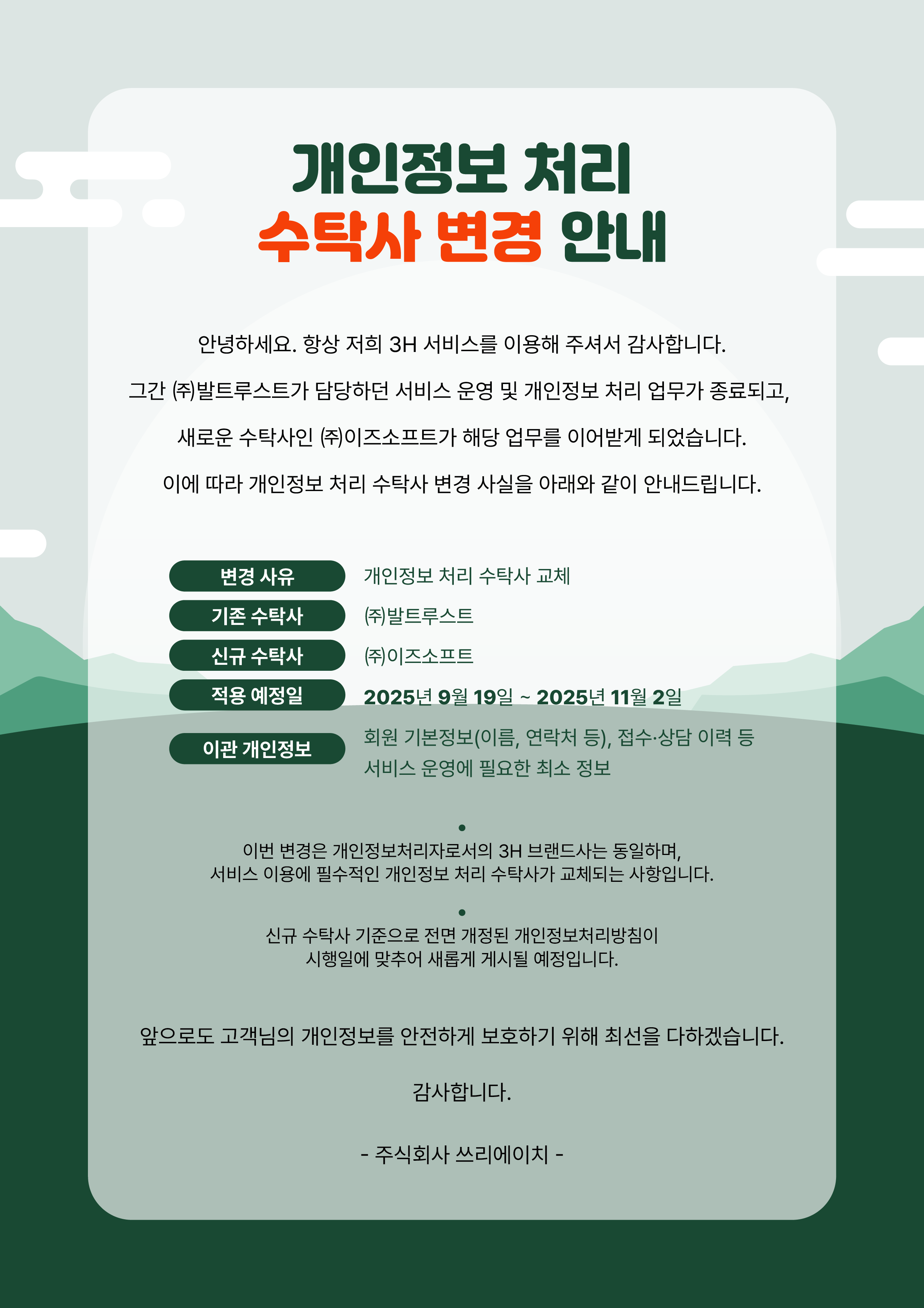 ㈜쓰리에이치(이하 “회사”)가 운영하는 홈페이지(이하 “사이트”)의 이용 조건 및 절차를 규정하여, 이용자 권익 보호와 원활한 서비스 운영을 목적으로 합니다.